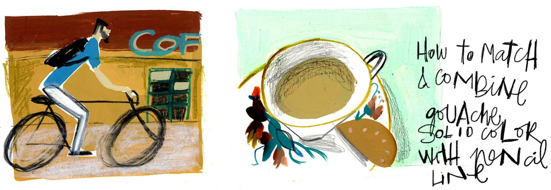 - lernen, wie man Gouachefarbe in Schichten verwendet und mit «trockenen» Techniken wie Farbstiften, Fettstiften, Graphitstiften usw. mischt.