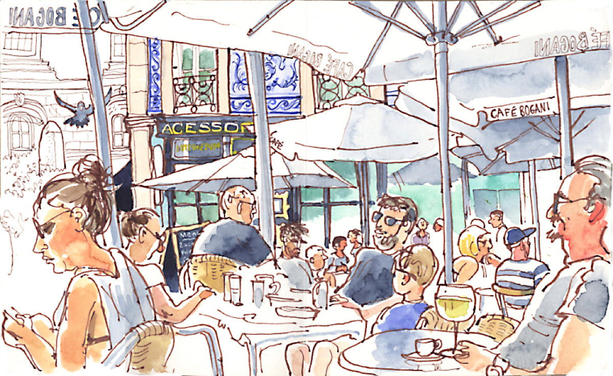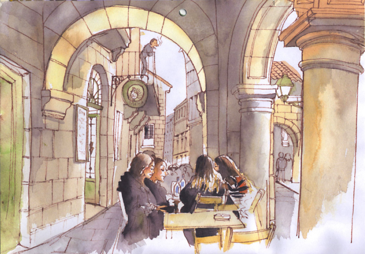 Das Skizzieren von Personen, die an einem Cafétisch sitzen, wird durch einige Faktoren erleichtert: Die Menschen bewegen sich eine Weile nicht, sie sind entspannt und bemerken wahrscheinlich nicht, dass sie gezeichnet werden und ausserdem braucht man nur die Hälfte des Körpers zu zeichnen! Es gibt zudem immer interessante Dinge auf den Tischen, und ein paar Posen reichen für die meisten Menschen aus. Indem wir die Szene in Ebenen aufteilen, im Vordergrund beginnen und uns nach hinten arbeiten, werden wir jede Linie Schritt für Schritt ausführen. In diesem Workshop werden wir uns mit Posen, Proportionen, Haar- und Hauttönen befassen, und wir werden Selbstvertrauen gewinnen beim Erfassen von Menschen im Freien und unterwegs.