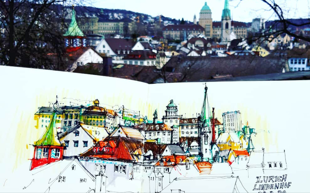 Brindarica Bose est suisse, d’origine indienne. Elle travaille à temps partiel dans l’édition et comme enseignante en art à l’École Club Migros. Pour elle, le croquis urbain est comme raconter des histoires. Elle a publié un livre, « Sketching Diaries », avec quatre autres artistes suisses en 2020. Ses dessins sont colorés et, bien que l’aquarelle soit son premier amour, elle aime mélanger crayons, stylos, craies grasses et tout ce qui lui tombe sous la main. Son style est « rapide et spontané » pour capturer l’essence d’une scène.