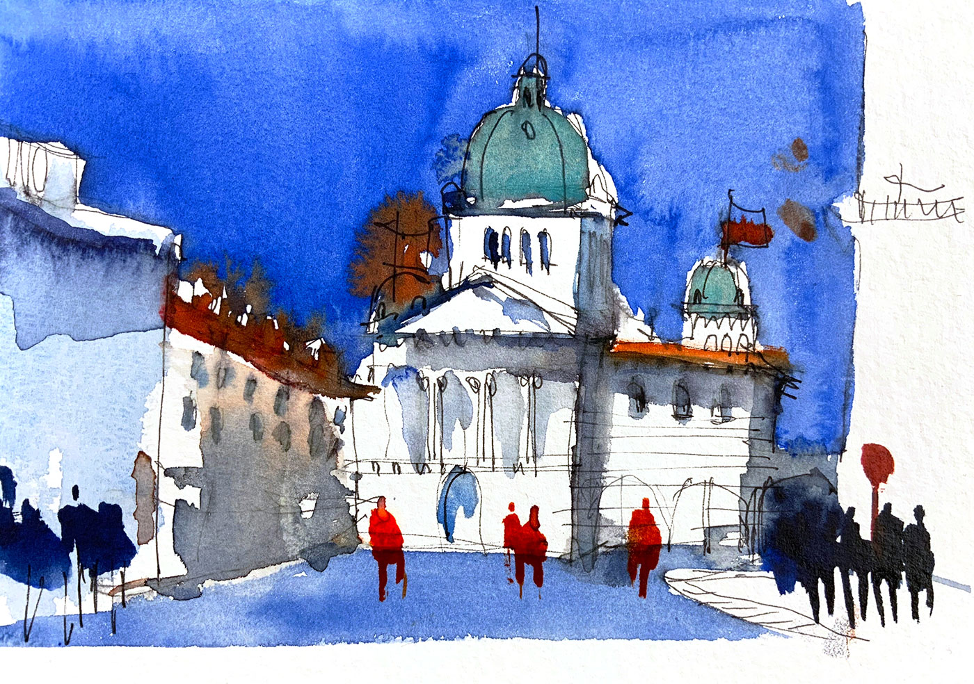Du papier adapté aux techniques humides. De l’aquarelle. Un feutre indélébile ou un stylo-plume avec de l’encre indélébile. Une brosse de la largeur de deux doigts environ ou un pinceau rond plus épais avec une bonne pointe (il s’agit d’avoir un pinceau avec lequel on peut aussi couvrir de grandes surfaces.)