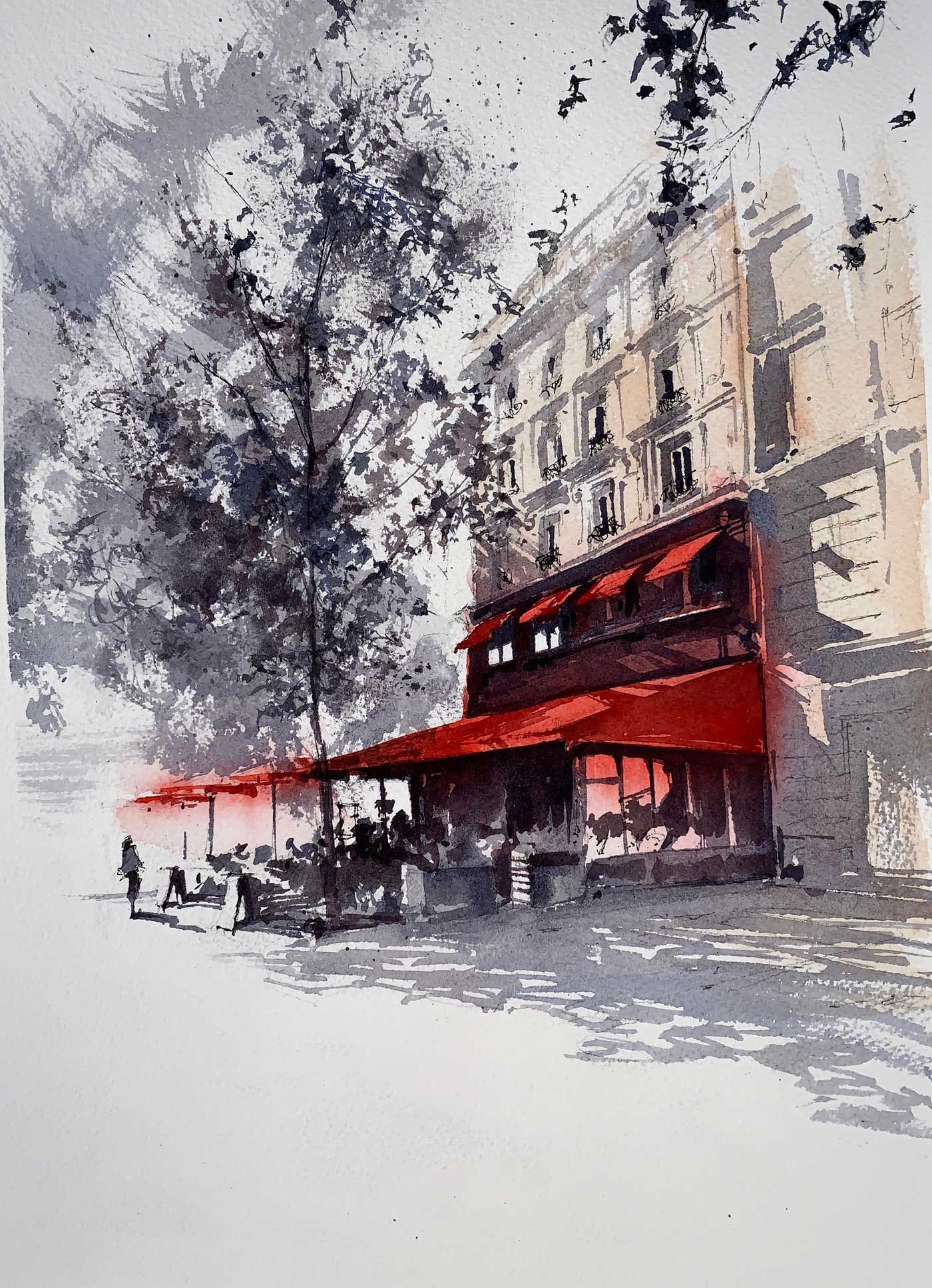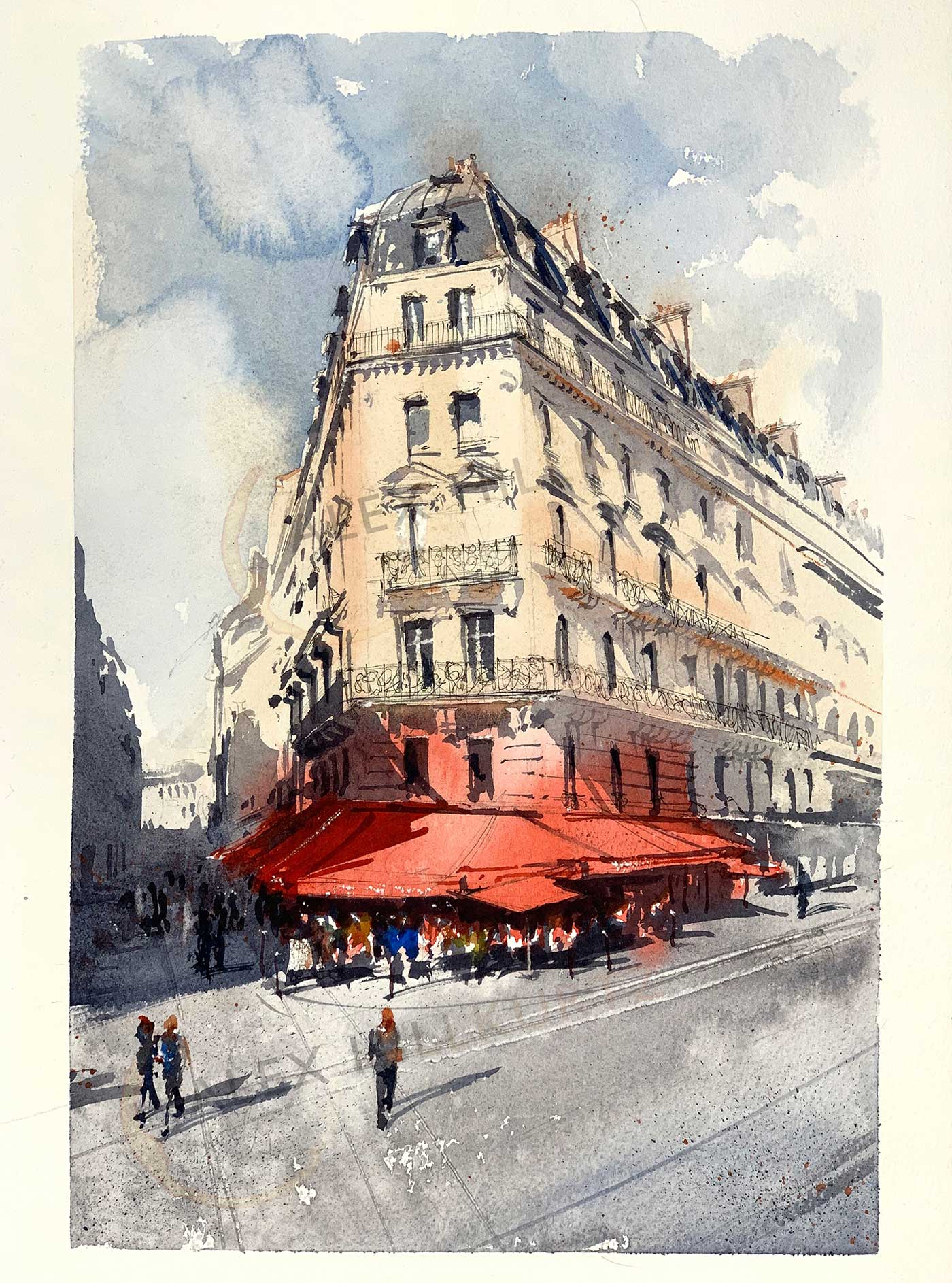 Alex Hillkurtz was born in England and grew up in California, where he established himself as a successful storyboard artist in Hollywood. Currently living in Paris, Alex is now a professional watercolor artist. He enjoys discovering aspects of the city that painting uniquely allows, using the language of cinema to inform his work.