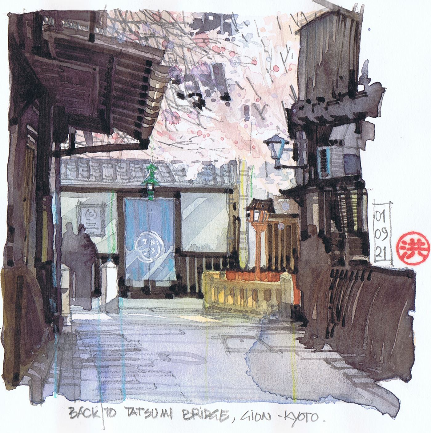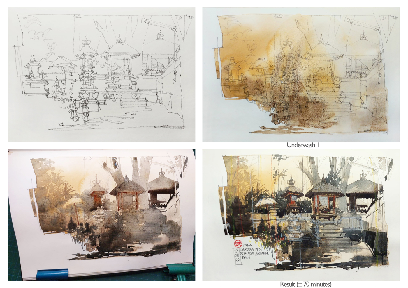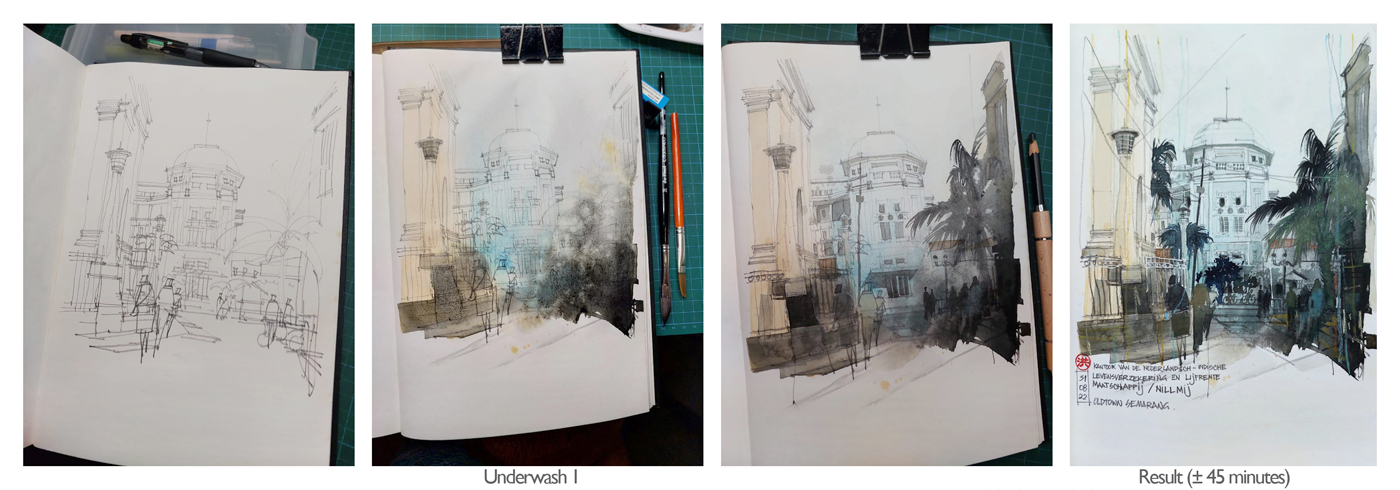 Urban Sketching can record and heighten the drama of a city. Wet on wet underwashes in the first step of watercolouring is one of the quickest ways to build this mood/drama. We can finish a dramatic urban sketch in more controlled time using this technique.