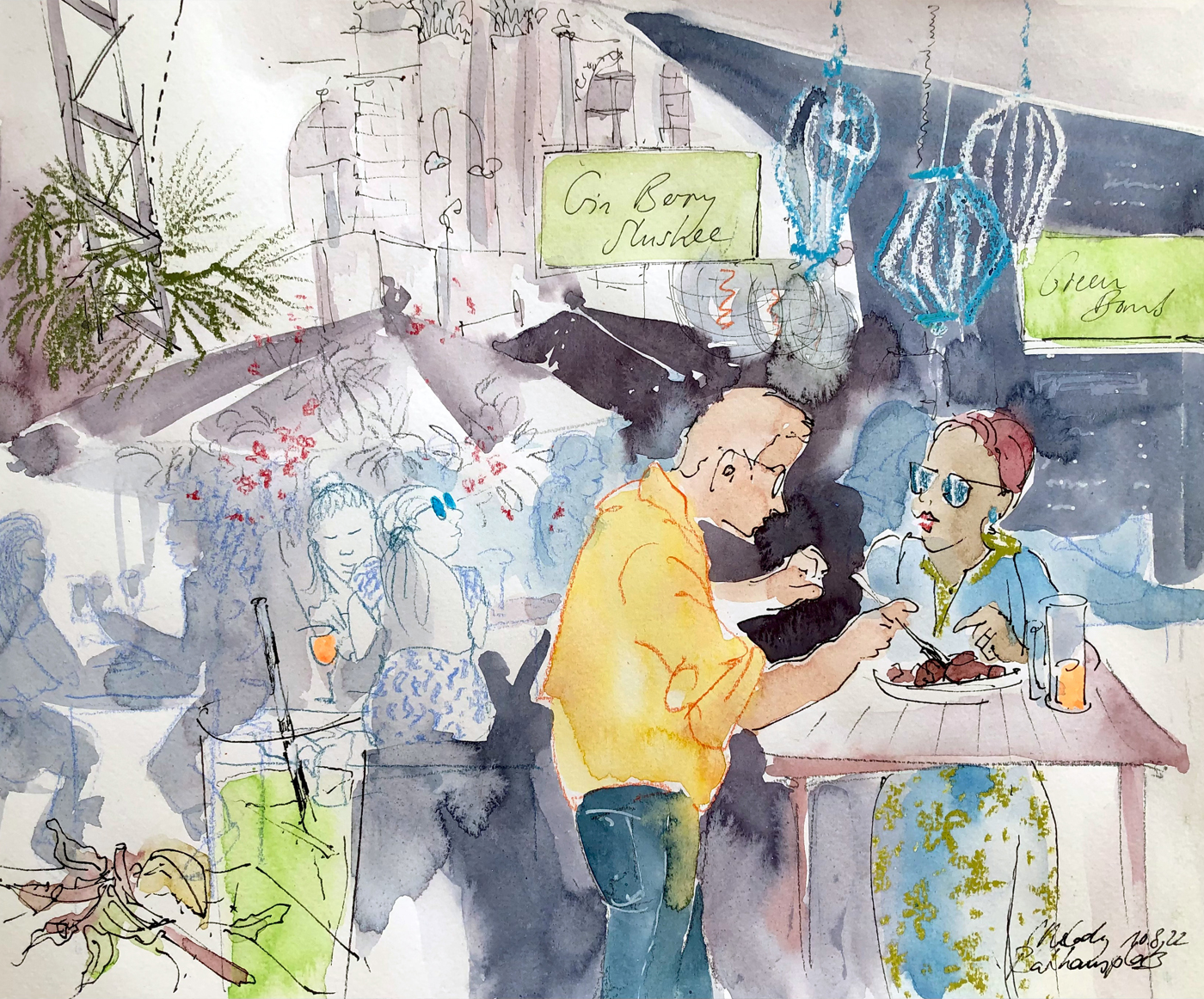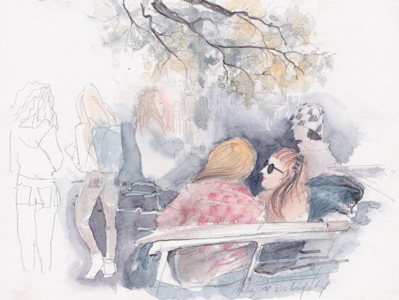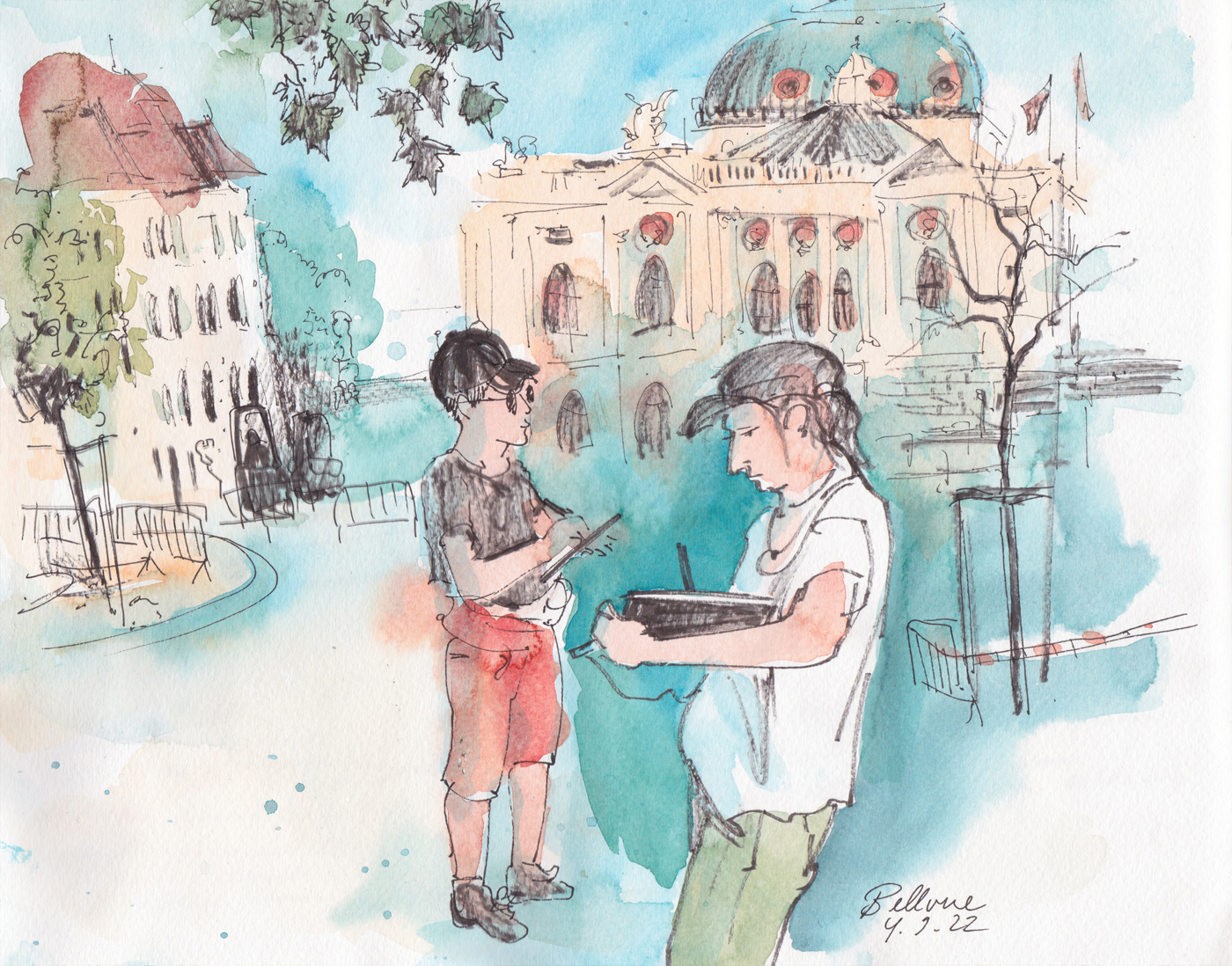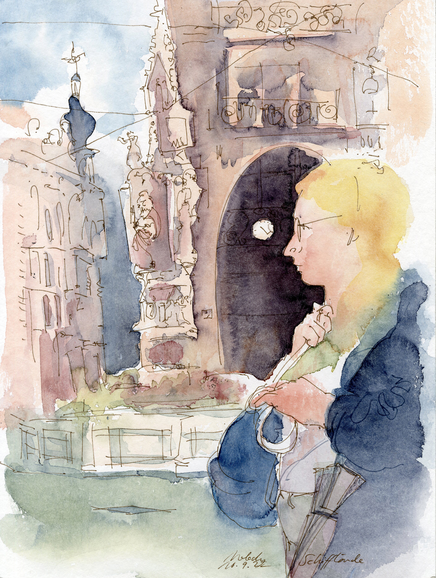 As sketchers, we have many effective design tools at our disposal to make an image exciting yet balanced, as well as to direct the viewer's gaze. This happens through different weighting in the picture, through contrasts such as light–dark, large–small, colorful–achromatic, cool–warm, dense–empty, straight–curved and fine–coarse. We experiment with different media such as graphite, fineliner, watercolor, colored pencils and oil pastels. Together we create city views that combine spatial depth, concentration on a focal point and a balance of the many facets of a city.