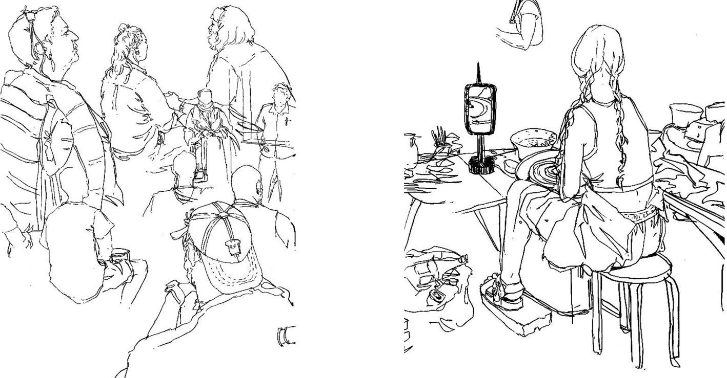 - Geduldig zeichnen: Manchmal bewegen sich die Personen sehr viel und man kann ein paar Minuten warten, bis sie die Pose einnehmen, die man zu skizzieren begonnen hat. Diese Zeiträume sind ideal, um die Umgebung des Motivs zu skizzieren und so eine Skizze eines Motivs im Kontext zu erhalten.
