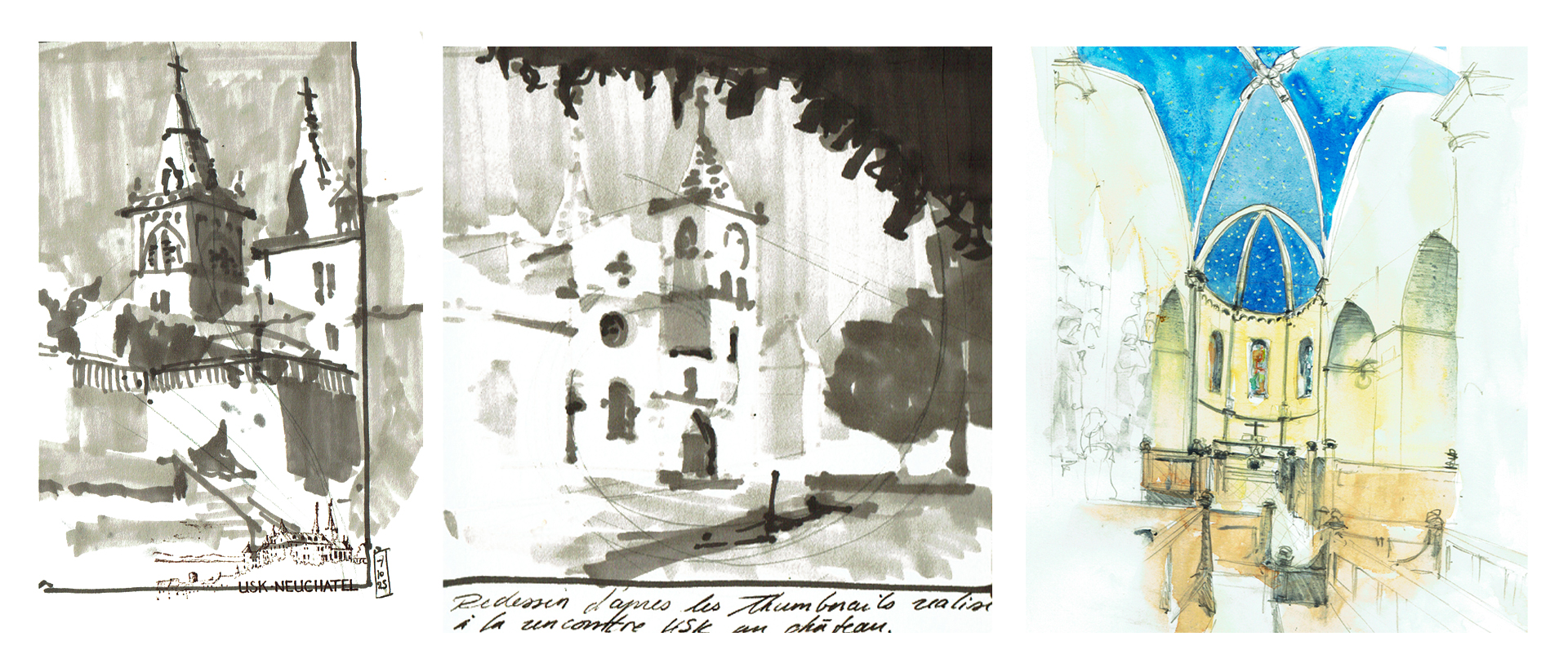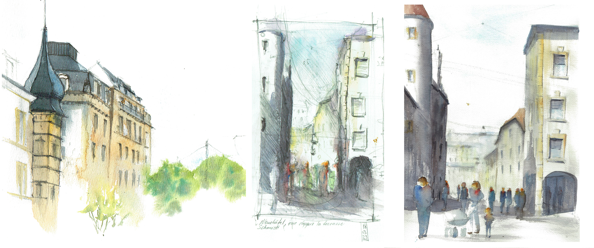 Paysage urbain panoramique de Neuchâtel à l'aquarelle et au pastel sec