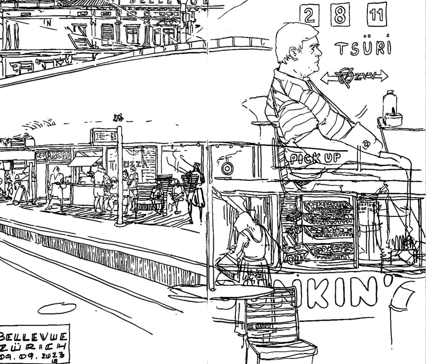 Autodidacte, j’ai découvert le croquis urbain vers 2012, d’abord en tenant un carnet de voyage où je mélangeais des dessins sur place et d’après photos, puis en cherchant délibérément des endroits où aller dessiner pour le simple plaisir de dessiner un lieu et des gens. Je vois le croquis urbain comme un journal des petits moments qui constituent la routine, le quotidien.