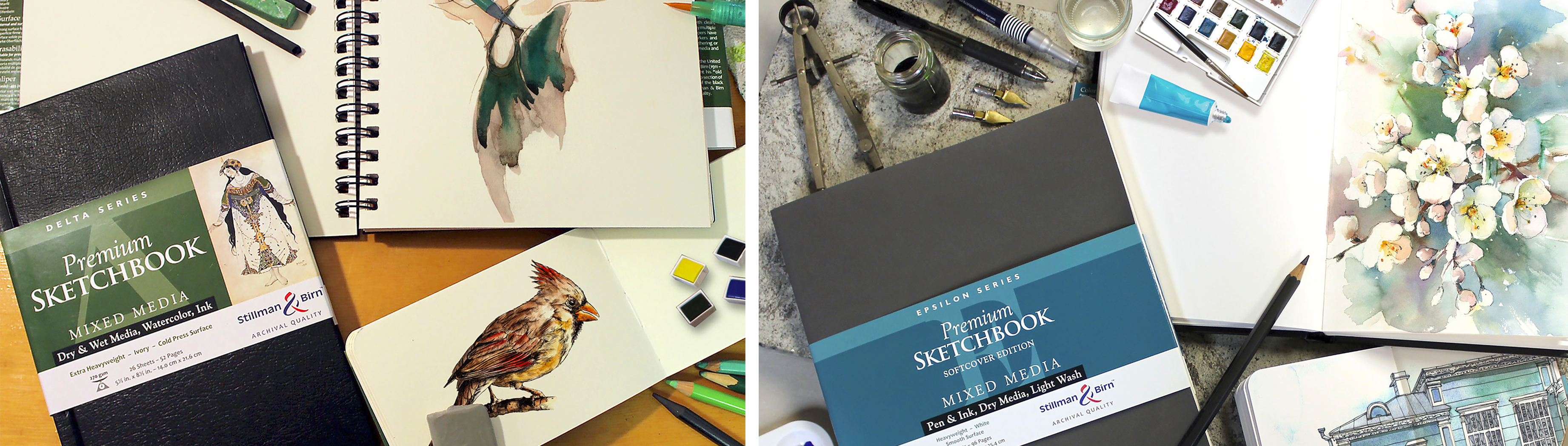 S&B sketchbook papers support wet media techniques, even layering multiple washes. Their wet strength is due to their (vegan-friendly) double sizing. This type of internal and surface sizings slows down both water and pigment absorption. As a result, pigment dries with exceptionally vibrant color.