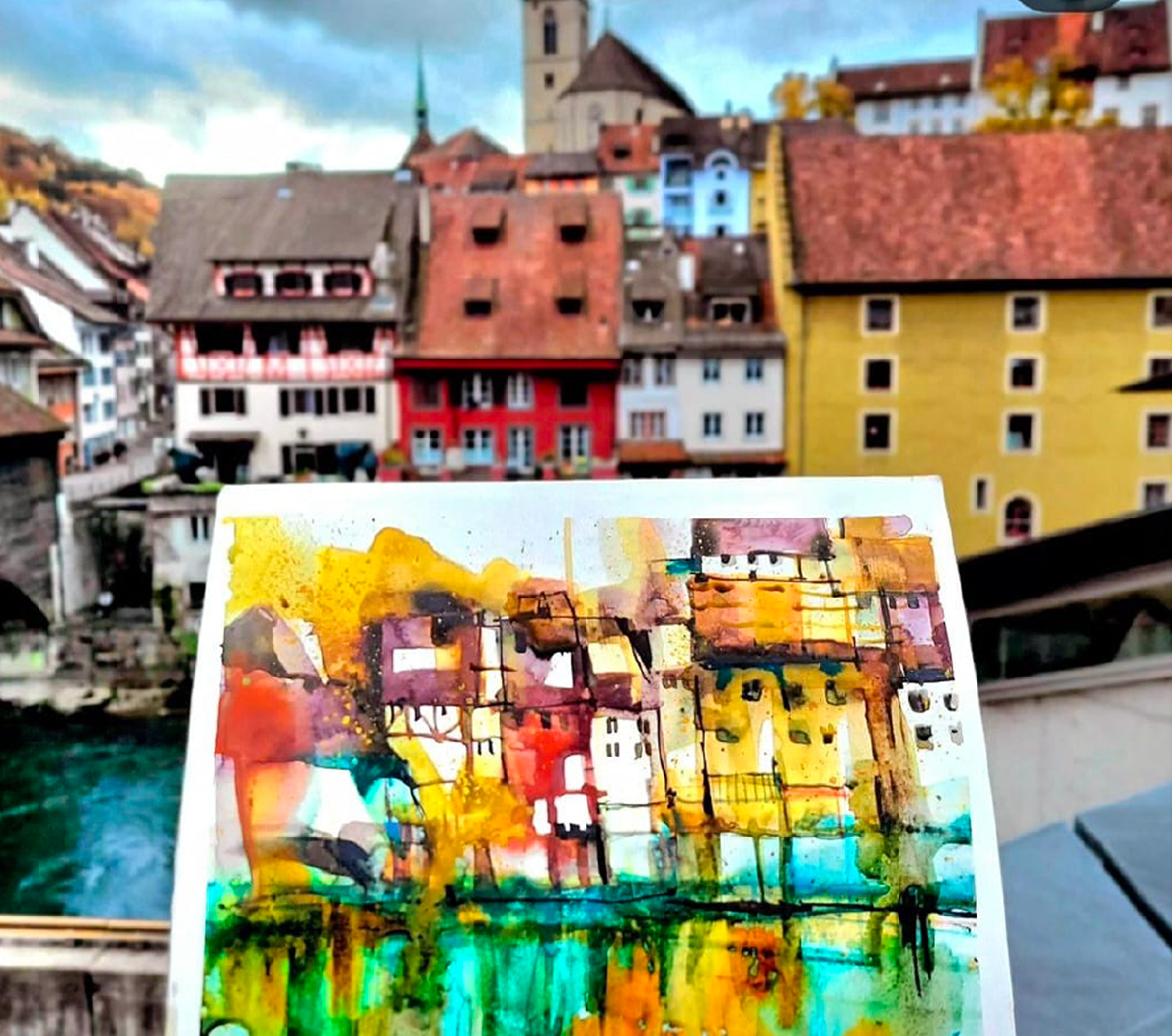 Brindarica Bose (Brinda) has been a passionate urban sketcher for 30 years. Born in India, she is living in Switzerland with her family for almost two decades. She works part-time as an art teacher in Migros Klubschule (Miduca) for the last 9 years and gives classes for watercolors, urban sketching and freehand sketching. She was appointed as a workshop instructor at the Swiss Urban sketchers Symposium in 2021 and 2022. Brinda loves to spice up her drawings with intense colors and sketch ‘on the go’. Her favorite medium is watercolors. She takes her colors and paper in snow, sea and sand and prefers working in a ‘loose style’, and ‘speed- sketches’ whenever she gets the chance. Brinda loves to teach and share her passion for urban sketching and volunteers to teach art to refugees with Integrations Amt in Wohlen, and underprivileged children (online, with Robin Hood Academy, India). She is also a writer and a publisher.