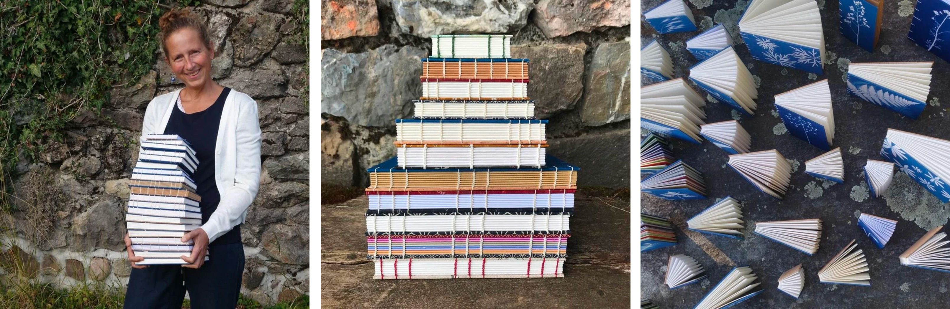 For the past 2 years, Irène has been giving cyanotype workshops, and she had the opportunity to lead notebook-making workshops on several occasions, which brings her great joy! The prospect of participating in the USK Symposium gives her great motivation to present her book binding work, offer her notebooks for sale and lead bookmaking workshops. Irène is a jack-of-all-trades who loves craftsmanship in all its forms. A self-taught bookbinder, she makes artists' notebooks that she assembles using Coptic binding, a robust technique that allows them to be opened flat. She also likes to make back-to-back, accordion and other crazy style notebooks. Her encounter with cyanotype led her to use this technique to illustrate the covers of her notebooks with fabric prints made from plants she gathers around her home…