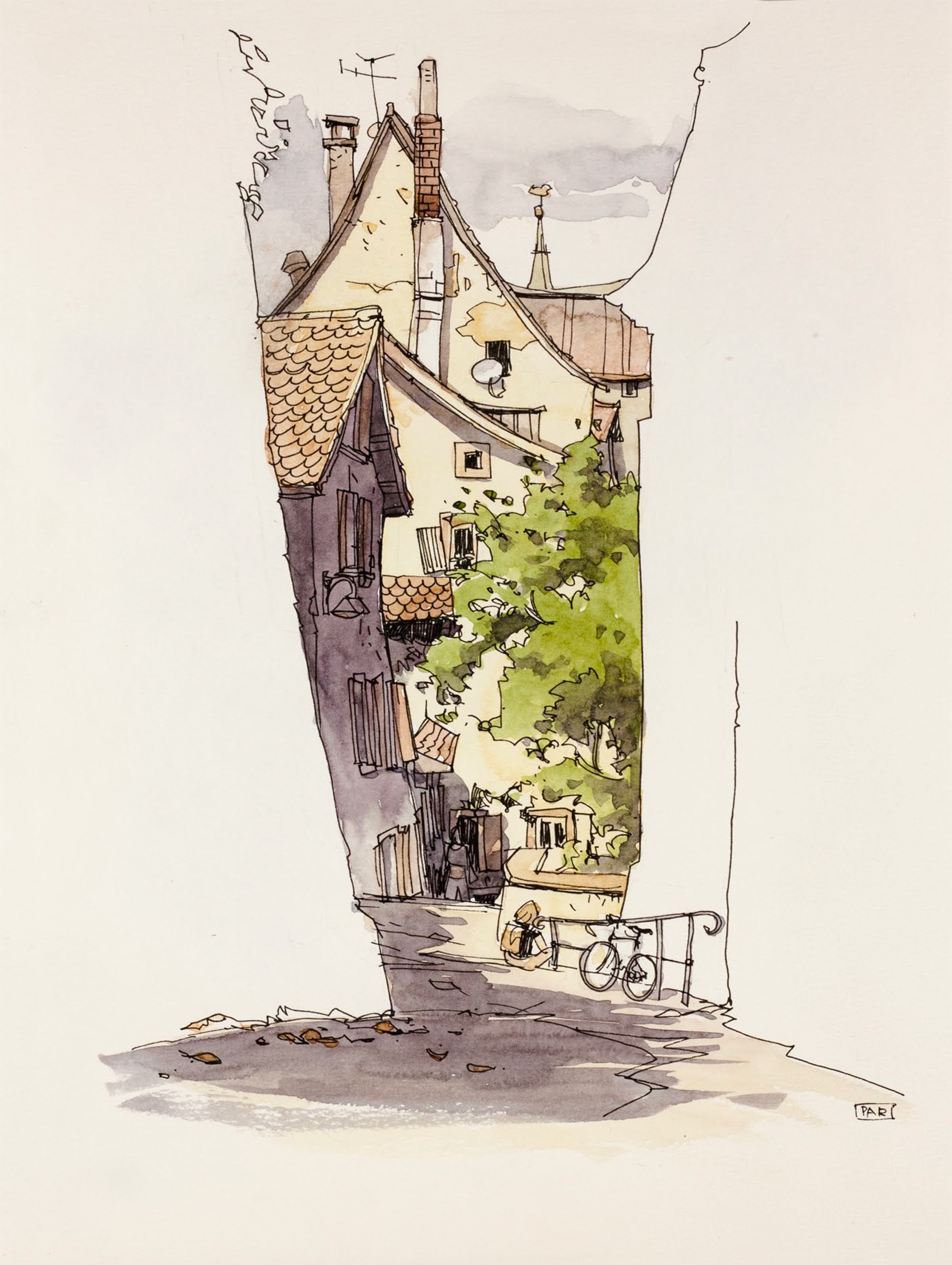 Pierre-Abraham Rochat is a Swiss illustrator with a lifelong passion for landscape design. As a freelance illustrator, he has completed numerous projects, including Swiss postage stamps, tourist posters, scientific and educational illustrations. His passion for landscape drawing has led him to create exhibitions in a graphic, uncluttered style. A fan of old buildings and life drawing, he is a natural member of the urban sketcher movement.