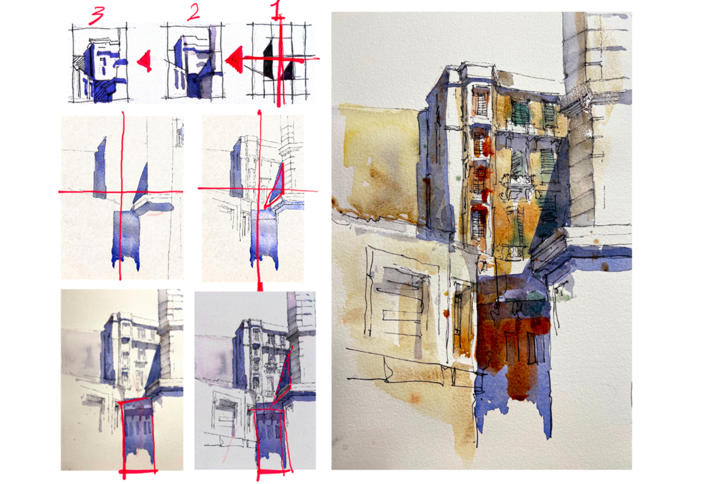 Capture a complex scene, especially in the case of classical architecture, without getting overwhelmed by details, ornamentation and complicated stylistic elements! There are many strategies for simplifying these types of scenes so that we can capture the moment, tell a story and reveal the sense of place without getting too involved in the details: one such strategy is to simplify the scene with shadows, not lines. Light and shadow are our main actors.